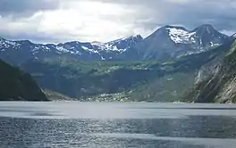 Tafjorden is an inner branch of the Norddalsfjorden/Storfjorden in Fjord Municipality in Møre og Romsdal county, Norway. It is part of the UNESCO World Heritage Site West Norwegian Fjords. The fjord is located southeast of the village of Sylte, the municipal center of Norddal Municipality. The small village of Tafjord is located at the end of the 12-kilometre (7.5 mi) long Tafjorden.[1] The only road leading to the rather isolated village of Tafjord goes through the 5,277-metre (3.3 mi) long Heggur Tunnel plus several other smaller tunnels on the northern shore of the fjord.