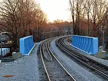The grade crossing at Harvard Street was replaced by a road bridge by the late 19th century, while Park Street was severed at the tracks.[lower-alpha 1] Talbot Avenue was extended from Codman Square to Blue Hill Avenue in 1897, with an underpass of the railroad tracks.[10] Lauriat Avenue (now Woodrow Avenue) was lowered under the tracks adjacent to Dorchester station around 1899.[11]