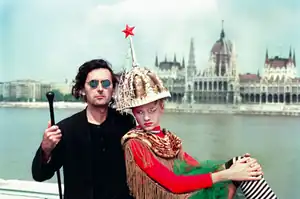Curator Gyula Musckovics characterized Király's work as anti-political, existing in a parallel realm not directly in opposition to the political one.[35] He was tolerated by the communist authorities despite flouting norms of socialist fashion good taste of the era.[9] Several of his creations employed communist iconography, including a 1987 dress that folded out to resemble the Red Star.[9][36] Such works were additionally infused with queer aesthetics; though Király was married with children, he may have been pansexual.[37] In a 2020 piece, artist Eszter Ágnes Szabó drew attention to Az Emberevő szerelme as being quintessentially "camp", and thus naturally suited to Király's "entire creative career".[5]:61 Szabó sees its usage of electric blue as one of the "almost mandatory references" to David Bowie, who had a cult status in the Hungarian underground, adding: "Bowie embodied almost everything that was opposed to the Hungarian official culture of the time".[5]:61,62 "No one could tell what statement Király was exactly making," Trufelman said of the parliamentary hat of 1989. "Was it a joke? Was it a political protest? Was it quite simply just a cool hat?"[35] By contrast, Reform magazine claimed that the item had been designed as part of a publicity stunt for its independent journalism: "Although Tamás Király claims to be apolitical, he still designed a parliamentary fur hat for Reform".[15]