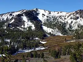 This landform's toponym was officially adopted in 1988 by the U.S. Board on Geographic Names.[5] The peak is named for the Tamarack tree, a member of the larch family which does not grow in this region,[6] but may have been confused with the Tamarack pine (Pinus contorta murrayana), also called Sierra lodgepole pine, which is a common tree around Lake Tahoe.[7]