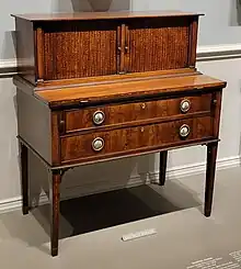 Tambour desk (Boston, 1793-1798) by John Seymour and Thomas Seymour with the tabletop folded up, handles of supporting sliders visible on the sides of the top drawer