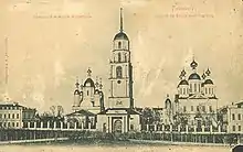 The city's layout began to change after 1781. As part of the redevelopment of the Russian cities at the 18th century the new system of provincial cities was to be embodied in their newest appearance – in the spatial and architectural order, expressed in geometric correctness and regularity of the international style of classicism, in contrast to the previously existing picturesque structure, which began to be perceived as a mess.[18] The general plan of Tambov was approved on December 9, 1781, by Catherine II. The urban planning document was aimed at clearing the urban space of old, random buildings, freely located, and creating an ordered grid-structure with geometrically regular lines of houses and straight streets. In 1781, Governor-General Roman Illarionovich Vorontsov was invited to Tambov from St. Petersburg to the newly opened position of the provincial architect from the "soldiers' children" of the collegiate registrar Vasily Antonovich Usachev, who became the coordinator of the implementation of Tambov's urban planning plan. The streets of the city center were based on the old roads that formed around the fortifications of the fortress, erected in 1636 under the governor Roman Boborykin. The central axis of the foundation of the oldest building in Tambov, the Transfiguration Cathedral now does not fit into the regular plan of the central part of Tambov, recalling the initial originality of the space of the fortified city.[18] A number of longitudinal streets appeared: First and Second Dolgie (Dolovye Streets) and Obvodnaya, which along the river valley. Rzhavets circled the western part of the city. From Tambov there were roads to Penza and the district towns of Kozlov, Morshansk, Lipetsk. Streets sprout along these roads. Kuzminskaya Street led out through the village. Kuzminka on the Astrakhan tract. Noblemen settled on the central cross street. The street is named Shirokaya Dvoryanskaya. In the shopping districts of the city, Khlebnaya Square was formed, it is bordered by Khlebnaya and Muchnaya streets. Near Sennaya (later Bazaar) squares are formed from the east by Proyezhaya, and from the west – by Vyez'zhaya streets. The outskirts of the streets were inhabited by petty officials – clerks and odnodvorets, which was reflected in their names. The southern part of the city was built up at the beginning of the 19th century. New, First, Second, Third, Fourth, Fifth streets appear here, and later – Kirpichnaya, Kamennaya and Invalidnaya streets.[19]