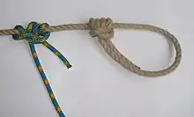 The Tarbuck knot was made popular around 1952 by Kenneth Tarbuck, a climber and skier, for use by climbers, and was primarily used with stranded nylon ropes, before the advent of kernmantle ropes made this use both unnecessary and unsafe.[1][2] It was used when the rope is subject to heavy or sudden loads,[3] as it will slide to a limited extent thus reducing shock (but with kernmantle ropes it can strip the outer sheath).[2] The knot was already employed by 1946 as "the knot" by American tree trimmers.[4]