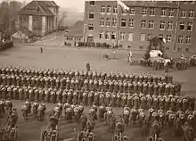 At the onset of World War II in September 1939, Poland was invaded by Germany and Nazi German occupation began. On September 6–8, 1939, the Einsatzgruppe II entered the town to commit various crimes against Poles.[13] Mass searches of Polish organizations, offices and houses,[14] and mass arrests of priests, teachers, intelligentsia and fighters of three anti-German, Silesian Uprisings (1919–1921) took place. The synagogue was burned while German minority enthusiastically welcomed invading Nazi forces. Already in September 1939, the Germans murdered over 20 Poles in the present-day districts of Lasowice, Strzybnica and Repty Śląskie.[15] Among the victims were miners, former insurgents and a school principal from nearby Chorzów.[15] Germany established and operated a prison for Poles in the town.[16] During the occupation, the Armia Krajowa (Home Army, the leading Polish underground resistance organization) undertook a sabotage campaign against Nazi forces, railroad-transport and local industry. The Germans operated two forced labour subcamps of the Stalag VIII-B/344 prisoner-of-war camp in the town.[17] Liberation of Silesia came in early 1945; in order to save the industrial infrastructure of the region, the Red Army opened an offensive supported by massive numbers of troops with minimal use of heavy artillery and air-bombardment. According to witnesses, the entire operation was extremely fast; countless, shoulder-to-shoulder, crowds of Russian soldiers passed through the town in matter of minutes followed by almost complete still.