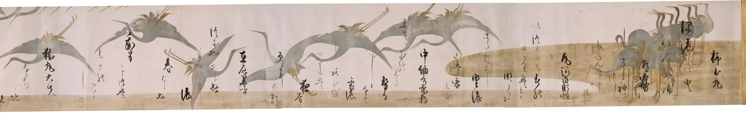 The text of the scroll is a compilation of waka poems from the poets known collectively as Thirty-Six Immortals of Poetry ("Thirty-Six Immortals of Poetry"), including one poem from each one of the 36 members of the group.[14] The visual motif is that of cranes, which stand or fly in flocks across the entire length of the scroll.[12] The skill of Sōtatsu's design and its "cutting-edge originality"[13] have been highly praised.[13][12]