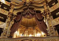 The main room (performance hall) is elliptic, has five tiers of boxes[1] and seats 1148 people. The luxurious royal box was lavishly decorated by the Italian Giovanni Appianni. The ceiling was painted by Manuel da Costa and the stage by Cirilo Wolkmar Machado.[3]