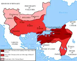 Murad I (nicknamed Hüdavendigâr, from Persian: خداوندگار, Khodāvandgār, "the devotee of God" – but meaning "sovereign" in this context) (Turkish: I. Murat Hüdavendigâr) (March or June 29, 1326, Sogut or Bursa – June 28, 1389, Battle of Kosovo) (Ottoman Turkish: مراد الأول) was the ruler of the Ottoman Empire, Sultan of Rûm, from 1359 to 1389. He was the son of Orhan I and the Valide Sultan Nilüfer Hatun (whose name means Water lily in Turkish), daughter of the Prince of Yarhisar or Byzantine Princess Helen (also named Nilüfer), who was of ethnic Greek descent[3][4][5] and became the ruler following his father's death in 1359.