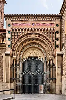 In 1909 the enormous historicist southern façade was constructed, which combines a Neo-Romanesque structure of semicircular archivolts with a typically neo-Mudéjar decoration. It was planned by the Modernisme architect Pau Monguió. The portico closes with an iron gate by Matías Abad, which was inspired by the choir inside the cathedral, made by the 15th century master Cañamache.