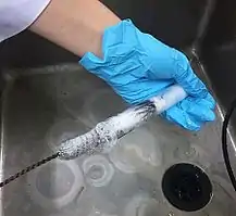 A test tube brush or spout brush is a brush used for cleaning test tubes and narrow mouth laboratory glassware,[1] such as graduated cylinders, burettes, and Erlenmeyer flasks. It is composed of nylon, synthetic, or animal fur bristles of various diameters lined against a rather sturdy wire handle with a looped end for hanging. The wire can be made from a wide range of metals, such as aluminium, bronze, beryllium, copper, and brass.[2] FDA grade brushes are designed to be resistant to acid and other corrosive chemicals, including aromatic and aliphatic hydrocarbons, ketones, ethyl acetate esters, and trichloroethylene.
