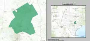 Texas's 31st congressional district of the United States House of Representatives covers a strip of Central Texas from the northern Austin suburbs up to Temple and Gatesville.