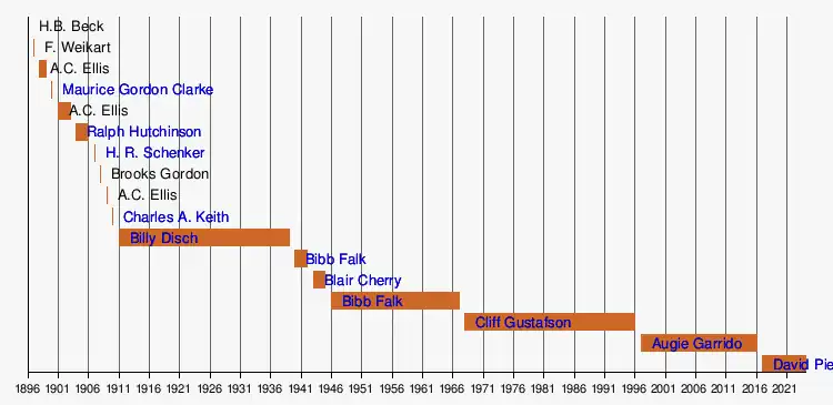 The Longhorn baseball program has been remarkably stable over the last century. Over a 105-year period (1911–2016), it had only four full-time coaches—Billy Disch (1911–1939), Bibb Falk (1940–1967), Cliff Gustafson (1968–1996), and Augie Garrido (1997–2016). David Pierce, previously head coach at Tulane University, was hired as Texas' fifth head coach on June 29, 2016.