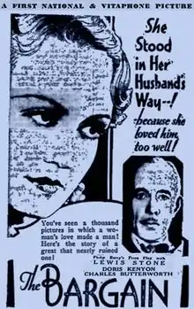 The Bargain (1931) is an all-talking American pre-Code comedy drama film produced and released by First National Pictures, a subsidiary of Warner Bros., and directed by Robert Milton.[1] The movie stars Lewis Stone, Evalyn Knapp, Charles Butterworth and Doris Kenyon. It was based on the 1923 play You and I by Philip Barry.