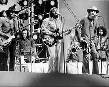 In mid-1970, the Beach Boys hired radio presenter Jack Rieley as their manager. One of his initiatives was to encourage the band to record songs featuring more socially conscious lyrics.[194] He also requested the completion of Smile track "Surf's Up" and arranged a guest appearance at a Grateful Dead concert at Bill Graham's Fillmore East in April 1971 to foreground the Beach Boys' transition into the counterculture.[195] During this time, the group ceased wearing matching uniforms on stage,[196] while Dennis took time to star alongside James Taylor, Laurie Bird, and Warren Oates in the cult film Two-Lane Blacktop, released in 1971. Later in 1971, Dennis injured his hand, leaving him temporarily unable to play the drums.[191] He continued in the band, singing and occasionally playing keyboards, while Ricky Fataar, formally of the Flames, took over on drums.[197] In July, the American music press rated the Beach Boys "the hottest grossing act" in the country, alongside Grand Funk Railroad.[193] The band filmed a concert for ABC-TV in Central Park, which aired as Good Vibrations from Central Park on August 19.[198]