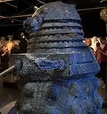During the scene in which the Doctor and Rory are talking after Rory has let him out of the Pandorica, one of the stone Daleks was originally supposed to move, operated by Haynes himself. However, the scene was cut from the final episode.[9] A stunt performer for Smith performed the sequence in which a future version of the Doctor who had been shot by a Dalek fell down the museum stairs; he did the stunt three times before Haynes captured the angles and shots he wanted.[3] On the DVD commentary, Haynes stated that the shot in the episode is mostly the first take.[9] River's costume in the episode was intended to resemble both the costumes of Princess Leia and Han Solo in the Star Wars films, so she appeared like a "female Han Solo".[9]