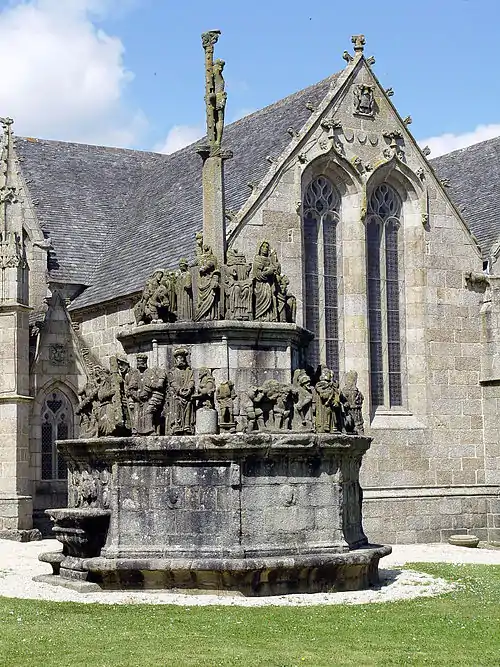 The Notre-Dame church at Kergrist-Moëlou dates back to the early 16th Century and was built by the brothers Guillaume and Pierre Jézéquel. The calvary dates to 1578 and the sculptural work involved is attributed to Guillaume Jézéquel. It was commissioned by the Baron de Pont-l'Abbé to celebrate the recovery of his daughter who was dying but recovered after he had made a pilgrimage to Kergrist to pray for help. In style the calvary is thought to have been inspired by that at Plougonven. It stands in the churchyard and there is an inscription on the west face reading "EN L AN 1578 G. JEZEQUEL." It was restored in the 19th Century but the original order in which the pieces had been arranged was not kept to. The 1922 restoration was carried out after the calvary was declared a "Monument Historique" in 1921, becoming the only calvary in Côtes d'Armor to be given such protection.[1] and another restoration was carried out in 1960. In the Breton language "Kergrist" means the "village of Christ". Several of the statues that survived the 1793 attack are arranged on the upper surface of the pedestal and the others stand on a ledge which runs around the pedestal's lower part.[2][3][4]