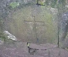 Five stones bearing crosses were located in the wall near the Chapel Well in recent times however one is now missing and another two now lie below the present day ground level. These crosses may once have marked the extent of church land as boundary markers, however some association with the old chapel cannot be completely ruled out.[11][12] A carved face is also present and some vague markings on two other stones.[12]