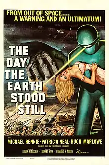 In the first scene of "The Day Tokyo-3 Stood Still", Maya praises the qualities of science with a phrase already used by Anno in his previous anime, Nadia: The Secret of Blue Water.[27][28] The installment reflects the director's epistemology interest, philosophically investigating the qualities or flaws of science and its relationship to man.[29][30] Its title constitutes a reference to the film "The Day the Earth Stood Still" (1951),[31][32] reflecting Anno's interest in science fiction.[33] In the course of the episode, cans of the UCC Ueshima Coffee Co. brand are shown,[34] similarly to another earlier work by Anno, Gunbuster.[30][27] The name of the Tokyo-3 election candidate, Nozoku Takahashi,[35] is also a reference to the Ghibli studio producer Nozomu Takahashi.[36][37]