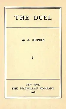 The Duel (Russian: Поединок; Poedinok) is a novel by Russian author Aleksandr Kuprin published in 1905.[1] It is generally considered his best work;[2] even though Kuprin's 1896 short story Moloch first made his name known as a writer[3] it was The Duel (1905) which made him famous.[4] Because of it "Kuprin was highly praised by fellow writers including Anton Chekhov, Maxim Gorky, Leonid Andreyev, Nobel Prize-winning Ivan Bunin"[5] and Leo Tolstoy who acclaimed him a true successor to Chekhov.