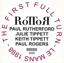 The First Full Turn is a live album by the free improvisation group known as RoTToR, featuring trombonist Paul Rutherford, vocalist Julie Tippett, pianist Keith Tippett, and bassist Paul Rogers. The bulk of the album, a long quartet track, was recorded on April 30, 1998, at Theatre P Scarron in Le Mans, France. A remaining solo trombone track was recorded on February 6, 1998, at St Giles Cripplegate in London. The album was released by Emanem Records later that year.[1][2][3][4]