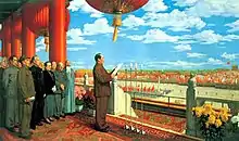 The Founding Ceremony of the Nation (or The Founding of the Nation, Chinese: 开国大典; pinyin: Kāiguó Dàdiǎn) is a 1953 oil painting by Chinese artist Dong Xiwen. It depicts Chairman Mao Zedong and other Communist Party officials proclaiming the People's Republic of China at Tiananmen Square on October 1, 1949. A prominent example of socialist realism, it is one of the most celebrated works of official Chinese art. The painting was repeatedly revised, and a replica painting made to accommodate further changes, as the leaders it depicted fell from power and later were rehabilitated.