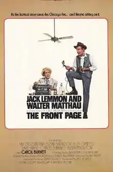 The Front Page is a 1974 American black comedy-drama film directed by Billy Wilder, and starring Jack Lemmon and Walter Matthau.[3] The screenplay by Wilder and I.A.L. Diamond[3] is based on Ben Hecht and Charles MacArthur's 1928 play of the same name, which inspired several other films, such as the 1931 film "The Front Page," the 1940 comedy film "His Girl Friday," and televised movies and series episodes.[4][5][6]