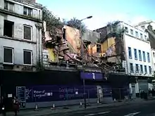 In April 2016 emergency work had to be carried out to make the building safe, with what safety inspectors described as "internal collapse, leaning walls and a high risk that cladding tiles may fall off".[15] Works to be carried out included the demolition of the facade in May. Structural reports regarding the facade were highly controversial with original reports by Sutcliffe being discredited by heritage specialists Morton Partnerships[16] who found that the construction of the facade were made of hollowed blocks rather than tiles as previously assumed. They found no significant threat of cladding 'tiles' falling off but recommended the removal and retention of the post WWII pediment which was not secured appropriately. Liverpool Council attempted to demolish the facade while the court appeal was ongoing but campaigners were able to obtain a block on this in time. The pediment was removed in line with what was suggested by Morton Partnership. [17] In August the same year, a legal challenge to save the building's facade was rejected, with the council declaring it beyond repair.[18] By September the building had been completely demolished.[19]