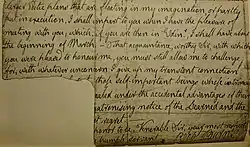 The 3 February 1789 letter from Burns to Bishop John Geddes was stitched into the volume at the front. It was addressed to The Reverend Mr. Geddes. Care of Dr Gregory - St Johns Street. Edinr. Wt. a book[1] This letter had a section at the end cut out, supposedly by Geddes as he disapproved of the "severely sarcastic" content. This also removed the text on the reverse side.[12] The words removed are within the brackets: "I gave up my transient connexion [with the merely Great,] those self-important beings whose intrinsic [worthlessness is con]cealed under the accidental advantages of their [rank, I cannot lose the] patronising notice of the Learned and the [Good without the bittere]st regret. [I have the] honour to be, Venerable Sir, your most respect[ful] [and ver]y humble servant, Robt Burns."[13]