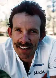 Patty Mooney[2] and Mark Schulze, an early user of the Helmet camera, learned about the sport of Mountain biking while in Canada in 1986. In 1987, the couple produced the mountain biking video, The Great Mountain Biking Video.[3][4][5] The video featured mountain-bike racing professionals Ned Overend, Martha Kennedy, John Tomac, Julia Ingersoll, Tinker Juarez, Trials rider, Kevin Norton and Olympian John Howard (cyclist) who instructed viewers on how to properly ride a mountain bike.
