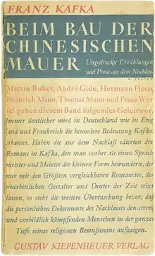 The Great Wall of China (German: Beim Bau der Chinesischen Mauer) is the first posthumous collection of short stories by Franz Kafka published in Germany in 1931. It was edited by Max Brod and Hans Joachim Schoeps and collected previously unpublished short stories, incomplete stories, fragments and aphorisms written by Kafka between 1917 and 1924. The first English translation by Willa and Edwin Muir was published by Martin Secker in 1933. The same translation was published in 1946 by Schocken Books.