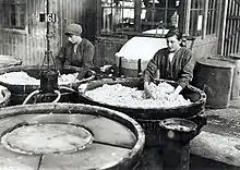 The influx of workers to the factory led to the building of two townships, Eastriggs and Gretna. Many of the Gretna Girls lived in group hostels which were staffed by matrons.[1] These temporary buildings were bitterly cold in the winter and the women living there had little to no privacy—with only curtains separating sleeping areas. The huge scale of the buildings of these townships and accommodation had an impact on the local area. In 1916, the State Management Scheme was introduced in Carlisle and Gretna. This scheme involved the nationalisation of the brewing and selling of alcohol, bringing both under state control. The rationalisation for this introduction was the protection of morals of the munition workers.[5] In addition to this, the factory was patrolled by the newly formed Women's Police Service. The women police's duties involved the searching of munitions workers for contraband items, and the maintaining of their morals.[4]
