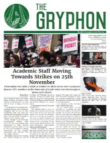 The Gryphon is the student newspaper of the University of Leeds. It is published monthly during term time and its editor, the newspaper's only paid position, is elected annually by Leeds University Union members. The articles are written by students and are largely about local and university issues.