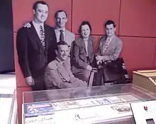 In 1937, CBC Regional Program Director George Taggart was given the assignment to come up with a Monday-through-Friday half-hour variety program that would fill the period 1:00 to 1:30 p.m. E.S.T. His tight budget permitted only four musicians. To “lead the band”, and as Master of Ceremonies, Taggart’s choice was Bert Pearl, whose real name was Bert Shapira. Credited with coming up with the concept that became the Happy Gang, Pearl's on-air persona was "that slap-happy chappy, the Happy Gang's Own Pappy."[5] His fellow musicians were trumpeter Robert (Bob) Farnon, violinist Blain Mathé and organist Kathleen (Kay) Stokes. Stokes was already a popular entertainer; she had been the staff organist at CFRB in Toronto, and was also known in vaudeville and on the air as "Canada's Sweetheart of the Theatre Organ."[6] She was the only female member of the Happy Gang, and she remained with them throughout their 22 years on the air.[7] The fact that Stokes was the Happy Gang's only female member was mentioned in the show's signature song: they would sing "It’s the Happy Gang with the boys and Kay Stokes. We hope you’ll like our music and our songs and our jokes..."[8]