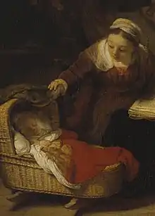 Rembrandt portrays the Holy Family as a typical family of Amsterdam in his day. In the foreground Jesus is asleep in the same style of wicker crib that can be seen in period paintings of mothers with babies by Pieter de Hooch. Mary looks up from her book to take a peek at the sleeping child under the crib curtain (Dutch: klamboe). In the background Joseph is working on making a yoke.The yoke refers both to the coming of the Lord according to Isaiah ("For the yoke of their burden, and the bar across their shoulders, the rod of their oppressor, you have broken as on the day of Midian"), as well as the words of Jesus according to Matthew the Apostle ("Come to me, all you who are weary and burdened, and I will give you rest. Take my yoke upon you and learn from me, for I am gentle and humble in heart, and you will find rest for your souls, for my yoke is easy and my burden is light").