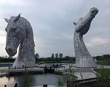 The Kelpies are 30-metre-high (98 ft) horse-head sculptures depicting kelpies, located between Falkirk and Grangemouth, but the Kelpies themselves are situated in Grangemouth,[1] standing next to an extension to the Forth and Clyde Canal, and near the River Carron, in The Helix, a parkland project built to connect sixteen communities in the Falkirk Council Area, Scotland.[2] The sculptures were designed by sculptor Andy Scott and were completed in October 2013.[3] The sculptures form a gateway at the eastern entrance to the Forth and Clyde canal, and the canal extension built as part of The Helix land transformation project. For a short time, they were the tallest equine statues in the world until Pegasus and Dragon was completed the following year.