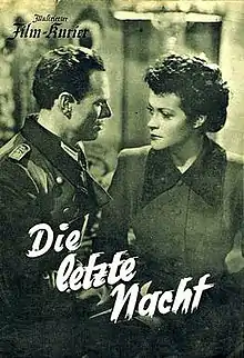 The Last Night (German: Die letzte Nacht) is a 1949 German drama film directed by Eugen York and starring Sybille Schmitz, Karl John, Margarete Haagen.[1] It was made by the Hamburg-based company Real Film at the Wandsbek Studios. The film's sets were designed by Herbert Kirchhoff. The film is set in German-occupied France in 1944 where a female resistance operative and a German army officer fall in love. It was not a box office success on its release.