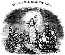 The fairs organizers raised thousands of dollars a year by selling things such as "ladies' aprons, cloaks, cuffs, bags, purses," "knitted quilts," "inkstands," "Ohio cheese," and "dolls in hundreds of every size, price, material, and costume."[2] In 1839 these items were joined by The Liberty Bell, modeled after the fashionable and popular gift books of the time. The book was sold to fair attendees and given without cost to the fair workers, as an acknowledgement of contribution to the abolitionist cause and token of the occasion.[3] Publication continued every year until 1846, and intermittently until 1859's edition, produced in 1858. (1840, 1850, 1855, and 1857 were missed)[3] As with many gift books, publication actually occurred late in the year prior to the date of the book, except for the very first (1839) edition. The next edition was thus dated 1841.