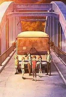 | 30 people using online pseudonyms gather on a single bus to head to the mysterious Nanaki Village to start a new life or escape from their old one. After getting annoyed by Valkana, the bus driver snaps and threatens to crash the bus and commit group suicide until Masaki pukes on his uniform. At a rest stop, a woman named Koharun appears to guide the bus group to a bridge shrouded in fog that supposedly leads to the village. | |||
