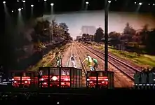 The backdrop of the stage was made from eight tracking and rotating video screens, which were described as being the largest ever built for a concert.[31][34] Another feature was an undulating LED floor with 36 cube-shaped lifts provided by Tait Tower;[35] placed in the middle of stage, the cubes were clad in LED video, measured 1 by 1 metre (3.3 ft × 3.3 ft) and could go up and down at a speed of 67 centimetres (26 in) per second and reach a height of 4.78 metres (15.7 ft). When retracted, the cube surfaces were precisely alined with the floor in order to create a flat surface.[31][35] Props for the show included a thurible, a large confessional, a moving motel room, fake guns including a Kalashnikov rifle and Uzis, large chandeliers, kinetic mirrors and a rustic multi-layered riser, from where Kalakan performed.[31][30][36] It took four planes to ferry the tour across countries.[15]