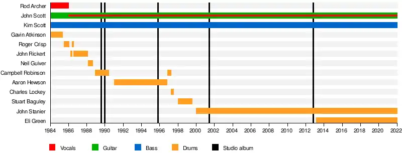 In March 2013 the band toured Australia with Eli Green on drums, sitting in for Stanier who was unable to tour due to his commitments with US band, Tomahawk. They completed further tours in 2014 and 2015, with Green on drums.[19] Rod Archer, their original vocalist until 1985, died of cancer on 26 February 2016.[20] In June 2015 the group had performed a benefit concert for Archer who was then undergoing chemotherapy.[21]
