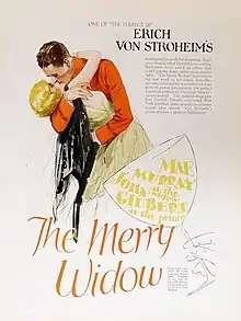 The Merry Widow is a 1925 American silent romantic drama/black comedy film directed and written by Erich von Stroheim. Released by Metro-Goldwyn-Mayer, the film stars Mae Murray, John Gilbert, Roy D'Arcy, and Tully Marshall,[3][4] with pre-fame uncredited appearances by Joan Crawford and Clark Gable.