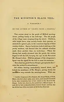 The story was published as "The Minister's Black Veil, a Parable" and credited "by the author of Sights from a Steeple" in The Token and Atlantic Souvenir for 1836; the issue also included Hawthorne's "The May-Pole of Merry Mount" and "The Wedding Knell".[2] It was later included in the collection Twice-Told Tales.