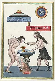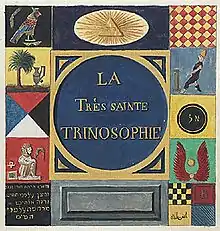 La Très Sainte Trinosophie, The Most Holy Trinosophia, or The Most Holy Threefold Wisdom, is a French esoteric book, allegedly authored by Alessandro Cagliostro or the Count of St. Germain.[1][2] Due to the dearth of evidence of authorship, however, there is significant doubt surrounding the subject.[3] Dated to the late 18th century, the 96-page book is divided into twelve sections representing the twelve zodiacal signs.[4] The veiled content is said to refer to an allegorical initiation, detailing many kabbalistic, alchemical and masonic mysteries.[5] The original MS 2400 at the Library of Troyes is richly illustrated with numerous symbolical plates.[6]