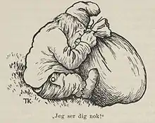 Troll tries to peek in bag and hears "I can still see you" (illustr. Kittelsen)