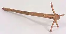 The youngest then devised a scheme to make her own getaway. She gained more time by feigning sickness and telling him it was no use coming back until twelve midnight, because she will not have his dinner ready before then. Then she stuffed straw into her clothes, and propped up the figure by the hearth, making the dummy look like it was holding a stirring-stick (tvare, pictured right) in its hand.[lower-alpha 5] She then ran back home to her mother, and had a sharpshooter to stay with them. The troll came back to his home demanded his supper; when the straw-woman did not answer, he struck and realized what had happened; then he saw the bodies of her sisters were missing as well. Raging, he came after them, but the sharp shooter scared him off. He went back, but just as he was to go below ground, the sun rose, and he shattered into bits.[1]