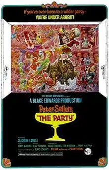 The Party is a 1968 American comedy film directed by Blake Edwards, and starring Peter Sellers and Claudine Longet. The film has a very loose structure, and essentially serves as a series of set pieces for Sellers's improvisational comedy talents.[2] Based on a fish-out-of-water premise, the film is about a bungling actor from India, Hrundi V. Bakshi (portrayed by Sellers), who accidentally gets invited to a lavish Hollywood dinner party and "makes terrible mistakes based upon ignorance of Western ways".[3]