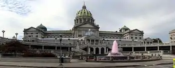 During the 2005 Pennsylvania Society weekend, Gene Stilp and Eric Epstein, governmental reform and anti-pay raise activists, hosted the "Pennsylvania People's Dinner," a reform-themed potluck dinner in the "darkened, barely heated" East Wing of the Pennsylvania State Capitol while the members of the Pennsylvania General Assembly are in New York City.[8][9] The event, described as "part parody, part celebration" of the November repeal of the controversial pay raise, featured paper plates and folding chairs for the potluck style dinner.[9] The hosts decorated the capitol with toy pigs, the mascot of the anti-pay-raise movement, and stuffed cows, mocking John Perzel's defense of the pay raise by claiming that "immigrant cow-milkers" make as much as legislators.[9] The dinner has become an annual event, with the lack of lighting and heating becoming part of the tradition.[10][11] The event has undergone several name changes: in 2006 it was called the "Pennsylvania New Society Dinner,"[12] in 2007 it was the "Real Pennsylvania Society Dinner."[13]
