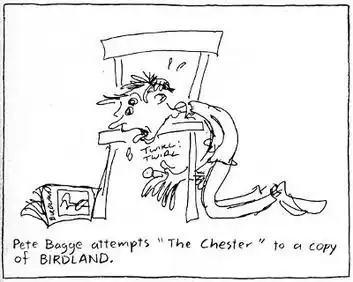 - Bagge, Peter (April 1991). Brown, Chester (ed.). "Peter Bagge attempts 'The Chester' to a copy of Birdland". Yummy Fur. Vortex Comics (24): 26. ISSN 0830-4386.