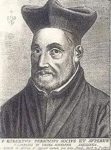 Raleigh was first named as the centre of the "School of Atheism" by the Jesuit priest Robert Persons in 1592.[2] "School of Night", however, is a modern appellation: the theory that this purported school was a clandestine intellectual coterie was launched by Arthur Acheson on textual grounds, in his Shakespeare and the Rival Poet (1903).[3][4] The new name is a reference to a passage in Act IV, scene 3 of Shakespeare's Love's Labour's Lost, in which the King of Navarre says "Black is the badge of hell / The hue of dungeons and the school of night."[5] Acheson's proposal was endorsed by notable editors John Dover Wilson and Arthur Quiller Couch in their 1923 edition of Love's Labour's Lost.[6] There are, however, at least two other recorded renderings of the line, one reading "suit of night"[5][7] and the other as "scowl of night".[8]