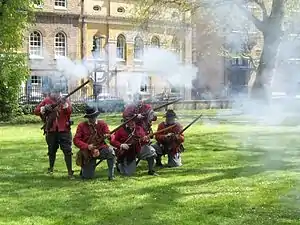 The Sealed Knot is made up of smaller groups, each run semi-autonomously, and known to their members as "regiments", their names and identities closely linked to regiments that took part in the English Civil War. Each of these regiments falls under one of the armies of the society: the Royalist Army, the Army of Parliament and the Army of Ireland and Scotland. The other sections are those who deal with pyrotechnics, the medical service, the living history group and Friends of the Knot. [4] There are two different types of regiment – "foote" are infantry with pikemen and musketeers, while "horse" are regiments of cavalry. The Thomas Rainsborough Company took part in the opening ceremony for a plaque commemorating the burial of Thomas Rainsborough in Wapping on 12 May 2013.