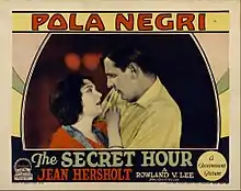 The Secret Hour is a lost[1] 1928 silent film romance drama directed by Rowland V. Lee and starring Pola Negri. A sound version was released during the latter half of 1928. While the sound version of the film had no audible dialog, it featured a synchronized musical score with sound effects using both the sound-on-disc and sound-on-film process. It is based on the 1924 Broadway play, They Knew What They Wanted by Sidney Howard.[2] It was produced by Paramount Famous Lasky Corporation and distributed through Paramount Pictures.[3][4]